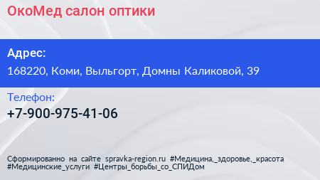 ОкоМед, салон оптики по адресу 168220, Коми, Выльгорт, Домны Каликовой, 39 в дальнейшем Организация, размещена в следующих категориях: