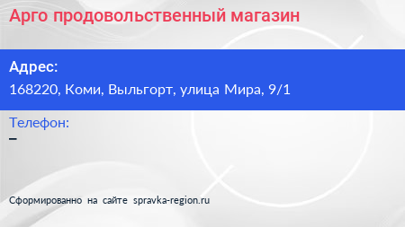 Арго, продовольственный магазин по адресу 168220, Коми, Выльгорт, улица Мира, 9/1 в дальнейшем Организация, размещена в следующих категориях:
