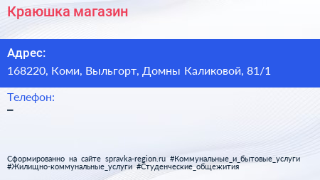 Краюшка, магазин по адресу 168220, Коми, Выльгорт, Домны Каликовой, 81/1 в дальнейшем Организация, размещена в следующих категориях:
