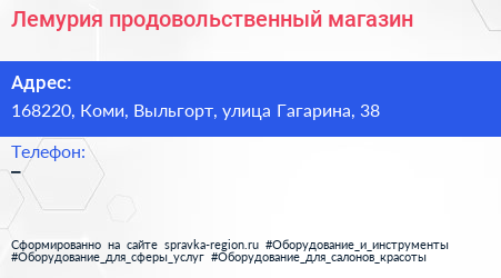 Лемурия, продовольственный магазин по адресу 168220, Коми, Выльгорт, улица Гагарина, 38 в дальнейшем Организация, размещена в следующих категориях: