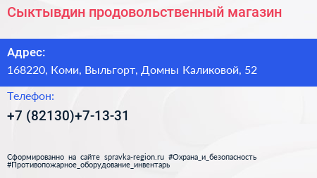 Сыктывдин, продовольственный магазин по адресу 168220, Коми, Выльгорт, Домны Каликовой, 52 в дальнейшем Организация, размещена в следующих категориях: