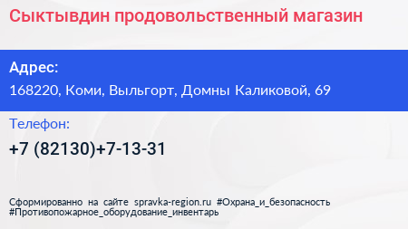 Сыктывдин, продовольственный магазин по адресу 168220, Коми, Выльгорт, Домны Каликовой, 69 в дальнейшем Организация, размещена в следующих категориях: