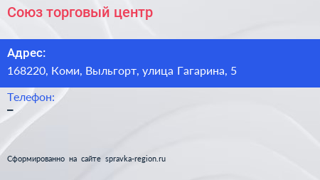 Союз, торговый центр по адресу 168220, Коми, Выльгорт, улица Гагарина, 5 в дальнейшем Организация, размещена в следующих категориях: