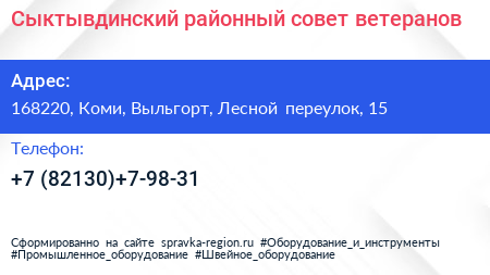 Сыктывдинский районный совет ветеранов по адресу 168220, Коми, Выльгорт, Лесной переулок, 15 в дальнейшем Организация, размещена в следующих категориях: