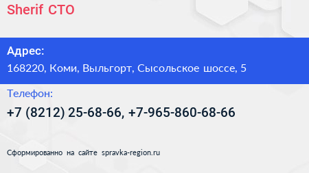 Sherif, СТО по адресу 168220, Коми, Выльгорт, Сысольское шоссе, 5 в дальнейшем Организация, размещена в следующих категориях: