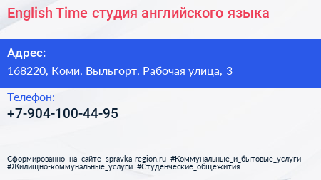 English Time, студия английского языка по адресу 168220, Коми, Выльгорт, Рабочая улица, 3 в дальнейшем Организация, размещена в следующих категориях: