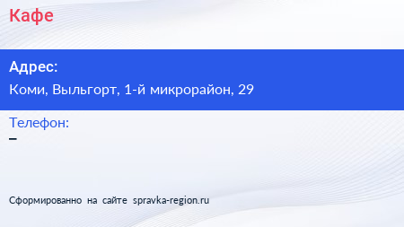 Кафе по адресу Коми, Выльгорт, 1-й микрорайон, 29 в дальнейшем Организация, размещена в следующих категориях: