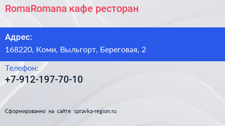 RomaRomana, кафе-ресторан по адресу 168220, Коми, Выльгорт, Береговая, 2 в дальнейшем Организация, размещена в следующих категориях: