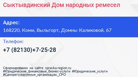 Сыктывдинский Дом народных ремесел по адресу 168220, Коми, Выльгорт, Домны Каликовой, 67 в дальнейшем Организация, размещена в следующих категориях: