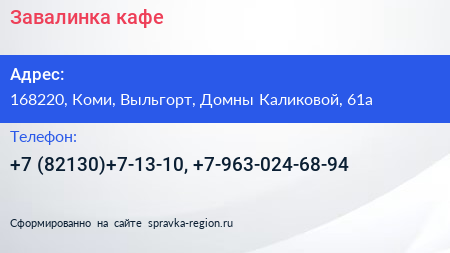 Завалинка, кафе по адресу 168220, Коми, Выльгорт, Домны Каликовой, 61а в дальнейшем Организация, размещена в следующих категориях:
