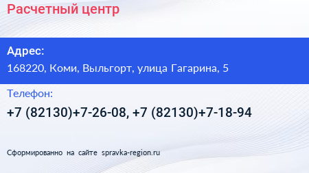 Расчетный центр по адресу 168220, Коми, Выльгорт, улица Гагарина, 5 в дальнейшем Организация, размещена в следующих категориях: