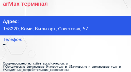 arMax, терминал по адресу 168220, Коми, Выльгорт, Советская, 57 в дальнейшем Организация, размещена в следующих категориях: