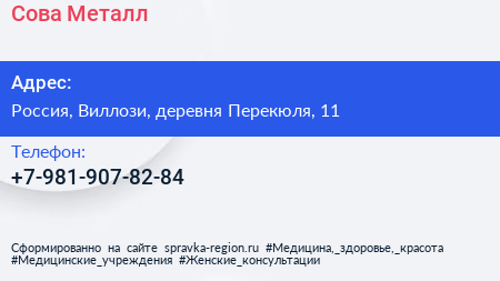 Сова Металл по адресу Старинный каменный дом, Тихий переулок, Перекюля, Виллозское городское поселение, Ломоносовский район, Ленинградская область, Северо-Западный федеральный округ, 198325, Россия в дальнейшем Организация, размещена в следующих категориях: