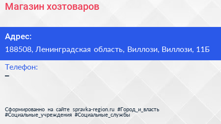 Магазин хозтоваров по адресу 188508, Ленинградская область, Виллози, Виллози, 11Б в дальнейшем Организация, размещена в следующих категориях: