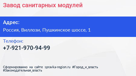 Завод санитарных модулей по адресу 1 с1, Пушкинское шоссе, Красное Село, Виллозское городское поселение, Ломоносовский район, Ленинградская область, Северо-Западный федеральный округ, 198301, Россия в дальнейшем Организация, размещена в следующих категориях: