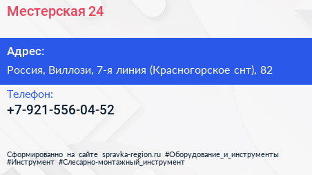 Местерская 24 по адресу 1-я поперечная линия, СНТ «Красногорское», Офицерское Село, Виллозское городское поселение, Ломоносовский район, Ленинградская область, Северо-Западный федеральный округ, 188508, Россия в дальнейшем Организация, размещена в следующих категориях: