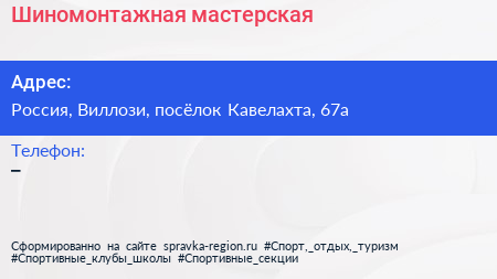Шиномонтажная мастерская по адресу Шинкoff, улица Кавелахты, Кавелахта, Виллозское городское поселение, Ломоносовский район, Ленинградская область, Северо-Западный федеральный округ, 198325, Россия в дальнейшем Организация, размещена в следующих категориях: