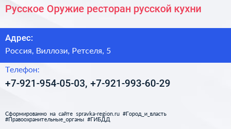 Русское Оружие, ресторан русской кухни по адресу Русское оружие, Подгорная улица, СНТ Можайское, Карвала, Виллозское городское поселение, Ломоносовский район, Ленинградская область, Северо-Западный федеральный округ, Россия в дальнейшем Организация, размещена в следующих категориях: