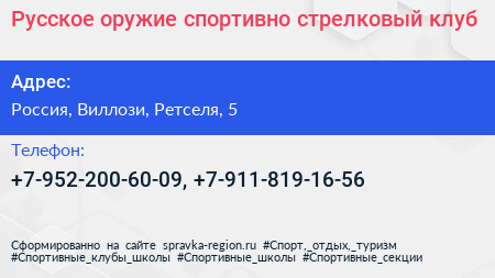 Русское оружие, спортивно-стрелковый клуб по адресу Русское оружие, Подгорная улица, СНТ Можайское, Карвала, Виллозское городское поселение, Ломоносовский район, Ленинградская область, Северо-Западный федеральный округ, Россия в дальнейшем Организация, размещена в следующих категориях: