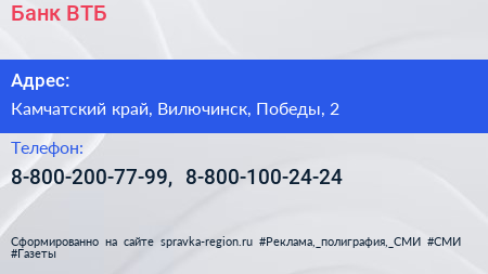Банк ВТБ по адресу Камчатский край, Вилючинск, Победы, 2 в дальнейшем Организация, размещена в следующих категориях: