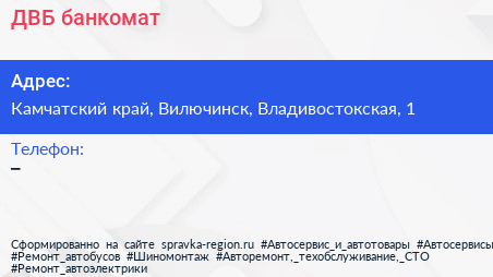 ДВБ, банкомат по адресу Камчатский край, Вилючинск, Владивостокская, 1 в дальнейшем Организация, размещена в следующих категориях: