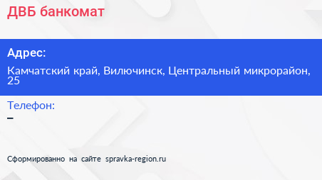 ДВБ, банкомат по адресу Камчатский край, Вилючинск, Центральный микрорайон, 25 в дальнейшем Организация, размещена в следующих категориях: