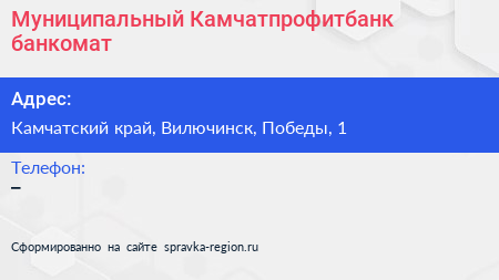 Муниципальный Камчатпрофитбанк, банкомат по адресу Камчатский край, Вилючинск, Победы, 1 в дальнейшем Организация, размещена в следующих категориях:
