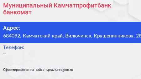 Муниципальный Камчатпрофитбанк, банкомат по адресу 684092, Камчатский край, Вилючинск, Крашенинникова, 28 в дальнейшем Организация, размещена в следующих категориях: