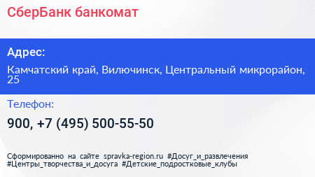 СберБанк, банкомат по адресу Камчатский край, Вилючинск, Центральный микрорайон, 25 в дальнейшем Организация, размещена в следующих категориях: