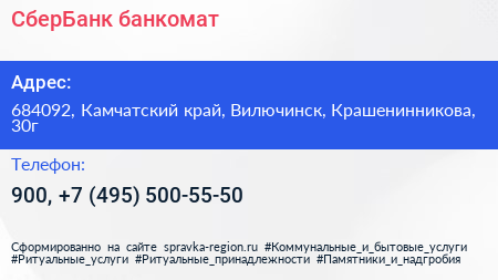 СберБанк, банкомат по адресу 684092, Камчатский край, Вилючинск, Крашенинникова, 30г в дальнейшем Организация, размещена в следующих категориях:
