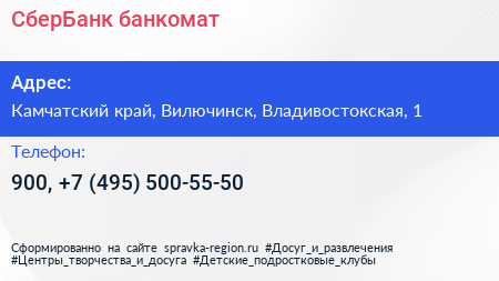 СберБанк, банкомат по адресу Камчатский край, Вилючинск, Владивостокская, 1 в дальнейшем Организация, размещена в следующих категориях: