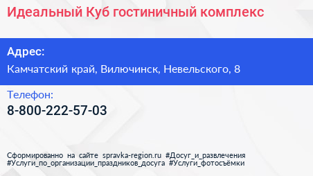 Идеальный Куб, гостиничный комплекс по адресу Камчатский край, Вилючинск, Невельского, 8 в дальнейшем Организация, размещена в следующих категориях: