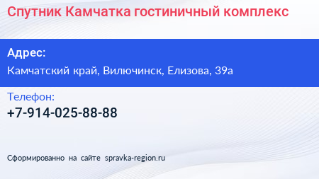 Спутник-Камчатка, гостиничный комплекс по адресу Камчатский край, Вилючинск, Елизова, 39а в дальнейшем Организация, размещена в следующих категориях: