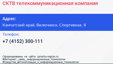 СКТВ, телекоммуникационная компания по адресу Камчатский край, Вилючинск, Спортивная, 8 в дальнейшем Организация, размещена в следующих категориях: