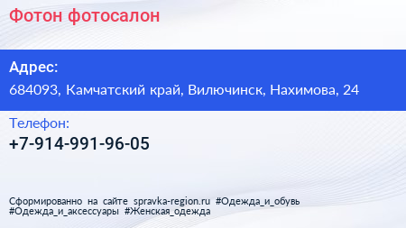 Фотон, фотосалон по адресу 684093, Камчатский край, Вилючинск, Нахимова, 24 в дальнейшем Организация, размещена в следующих категориях: