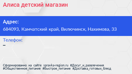 Алиса, детский магазин по адресу 684093, Камчатский край, Вилючинск, Нахимова, 33 в дальнейшем Организация, размещена в следующих категориях: