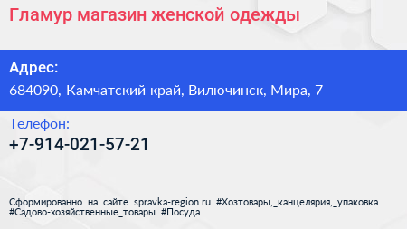 Гламур, магазин женской одежды по адресу 684090, Камчатский край, Вилючинск, Мира, 7 в дальнейшем Организация, размещена в следующих категориях: