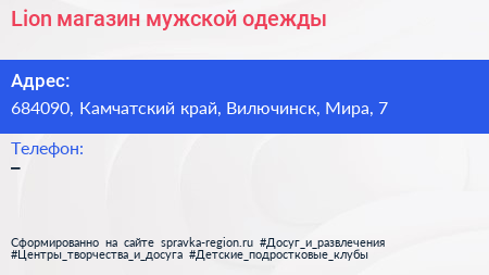 Lion, магазин мужской одежды по адресу 684090, Камчатский край, Вилючинск, Мира, 7 в дальнейшем Организация, размещена в следующих категориях: