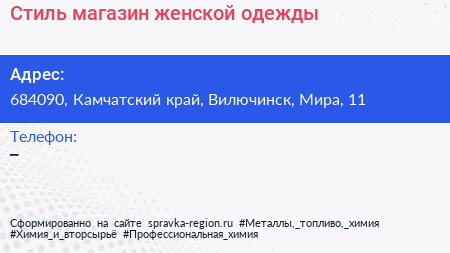 Стиль, магазин женской одежды по адресу 684090, Камчатский край, Вилючинск, Мира, 11 в дальнейшем Организация, размещена в следующих категориях: