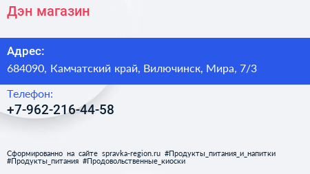 Дэн, магазин по адресу 684090, Камчатский край, Вилючинск, Мира, 7/3 в дальнейшем Организация, размещена в следующих категориях: