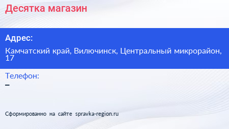 Десятка, магазин по адресу Камчатский край, Вилючинск, Центральный микрорайон, 17 в дальнейшем Организация, размещена в следующих категориях: