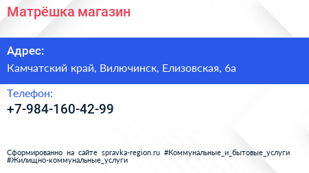 Матрёшка, магазин по адресу Камчатский край, Вилючинск, Елизовская, 6а в дальнейшем Организация, размещена в следующих категориях: