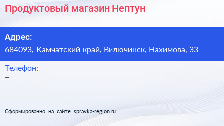 Продуктовый магазин Нептун по адресу 684093, Камчатский край, Вилючинск, Нахимова, 33 в дальнейшем Организация, размещена в следующих категориях: