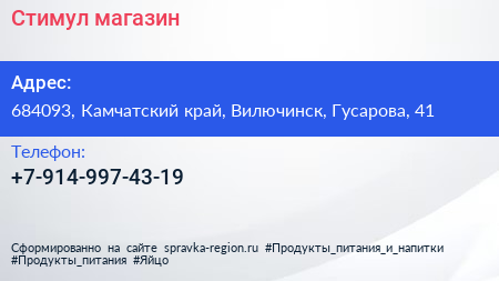 Стимул, магазин по адресу 684093, Камчатский край, Вилючинск, Гусарова, 41 в дальнейшем Организация, размещена в следующих категориях: