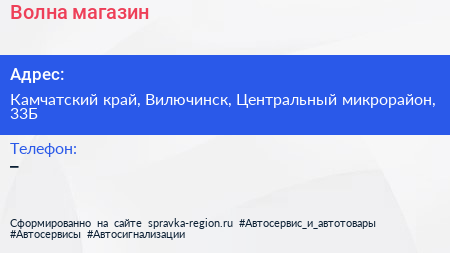 Волна, магазин по адресу Камчатский край, Вилючинск, Центральный микрорайон, 33Б в дальнейшем Организация, размещена в следующих категориях: