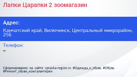 Лапки-Царапки 2, зоомагазин по адресу Камчатский край, Вилючинск, Центральный микрорайон, 25Б в дальнейшем Организация, размещена в следующих категориях: