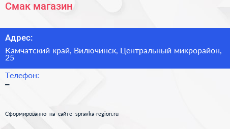 Смак, магазин по адресу Камчатский край, Вилючинск, Центральный микрорайон, 25 в дальнейшем Организация, размещена в следующих категориях: