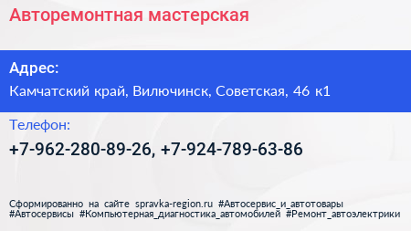 Авторемонтная мастерская по адресу Камчатский край, Вилючинск, Советская, 46 к1 в дальнейшем Организация, размещена в следующих категориях: