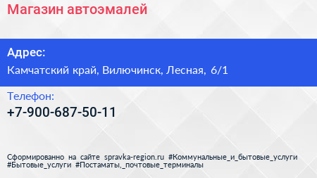 Магазин автоэмалей по адресу Камчатский край, Вилючинск, Лесная, 6/1 в дальнейшем Организация, размещена в следующих категориях: