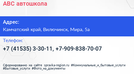 ABC, автошкола по адресу Камчатский край, Вилючинск, Мира, 5а в дальнейшем Организация, размещена в следующих категориях: